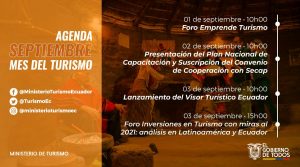 (Quito, Pichincha. 01.09.2020).- Con una agenda que contempla al menos 30 actividades académicas, tecnológicas, de reactivación, foros, declaratoria de Pueblos Mágicos, firma de convenios y más, arranca el Mes del Turismo que este año se enfocará en el desarrollo del turismo rural y en los desafíos que enfrenta la industria, tras el impacto de la pandemia del COVID-19.