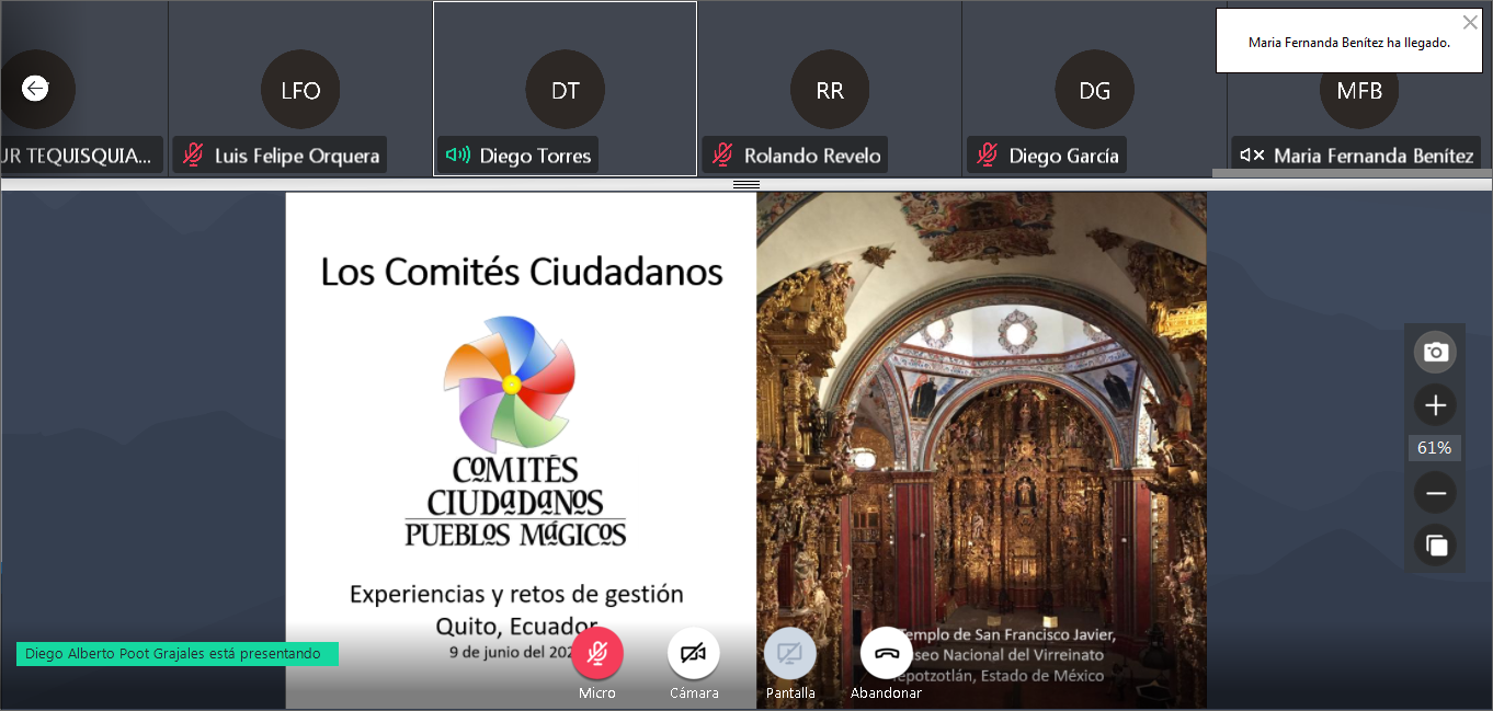 Poot Grajales expuso este martes, en el webinar “Comités Ciudadanos Pueblos Mágicos de México: Experiencias y retos de gestión”,  organizado por el Ministerio de Turismo de Ecuador.