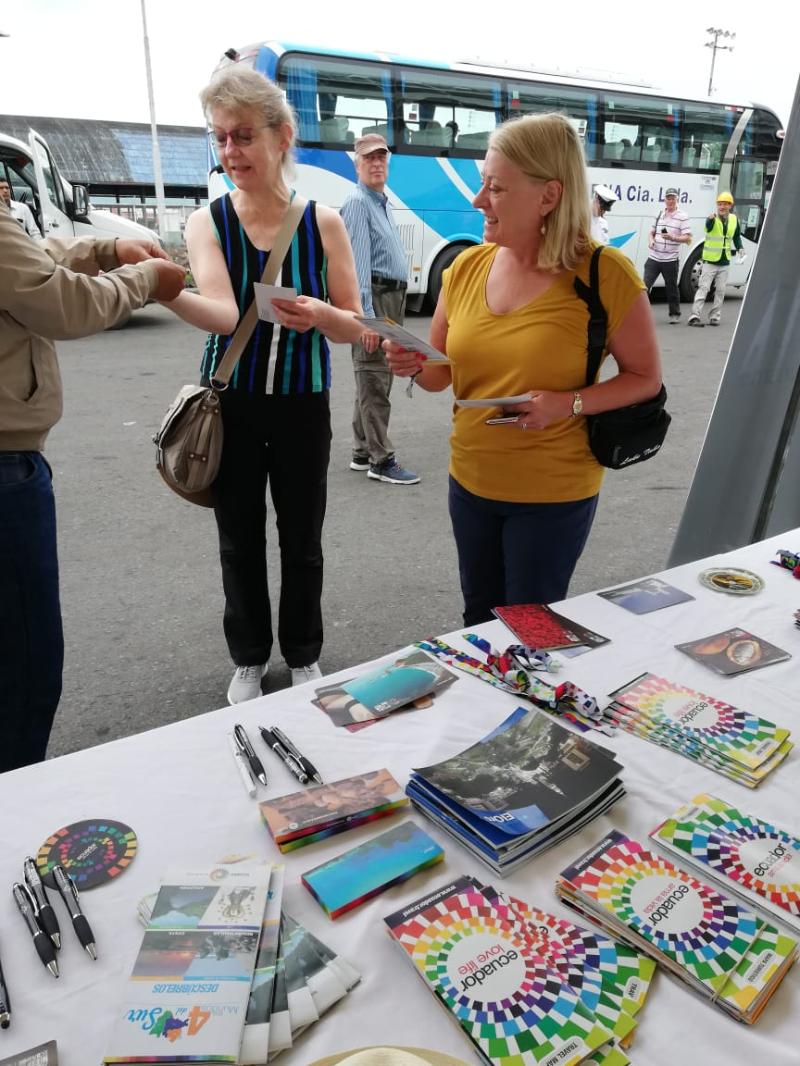 (Puerto Bolívar, 15-11-2019).- Más de 600 visitantes arribaron esta mañana a Puerto Bolívar con el crucero Seabourn Quest. Instituciones públicas, provinciales, academia y la población en general se reunió para recibir a los visitantes y promocionar a Ecuador.
