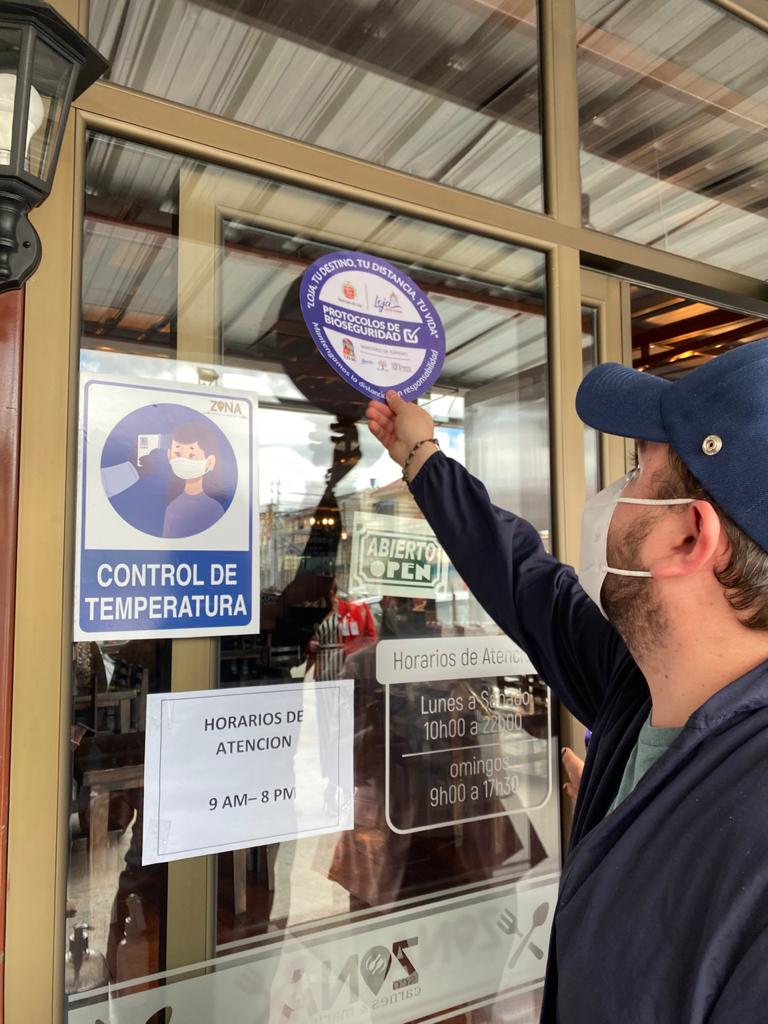 «Es importante mencionar que previo los operativos de verificación de cumplimiento de éstas medidas de bioseguridad, se ha socializado, difundido y capacitado sobre la aplicación de los protocolos de bioseguridad para establecimientos turísticos”, mencionó Ma. Paulina Paladines, líder zonal del Ministerio de Turismo, durante las inspecciones y colocación de adhesivos en establecimientos de Loja.