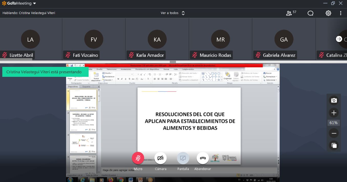 (Quito, Pichincha 18.05.2020) Los funcionarios del Ministerio de Turismo, a escala nacional, recibieron una capacitación virtual sobre la aplicación de protocolos de bioseguridad para establecimientos de alimentos y bebidas y de alojamiento turístico.