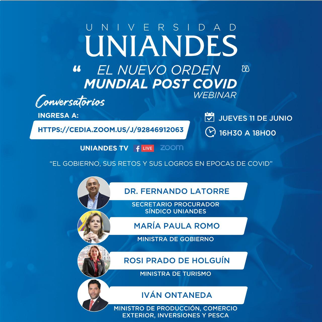 (Quito, Pichincha.11.06.2020) “La actividad turística en Ecuador tiene muchas posibilidades para salir de la crisis y para eso necesitamos profesionales con nuevas ideas y propuestas que motiven a los viajeros a volver a nuestro país”, dijo la ministra de Turismo, Rosi Prado de Holguín, durante el Conversatorio sobre el Nuevo Orden Mundial Post Covid, organizado por la Universidad UNIANDES.