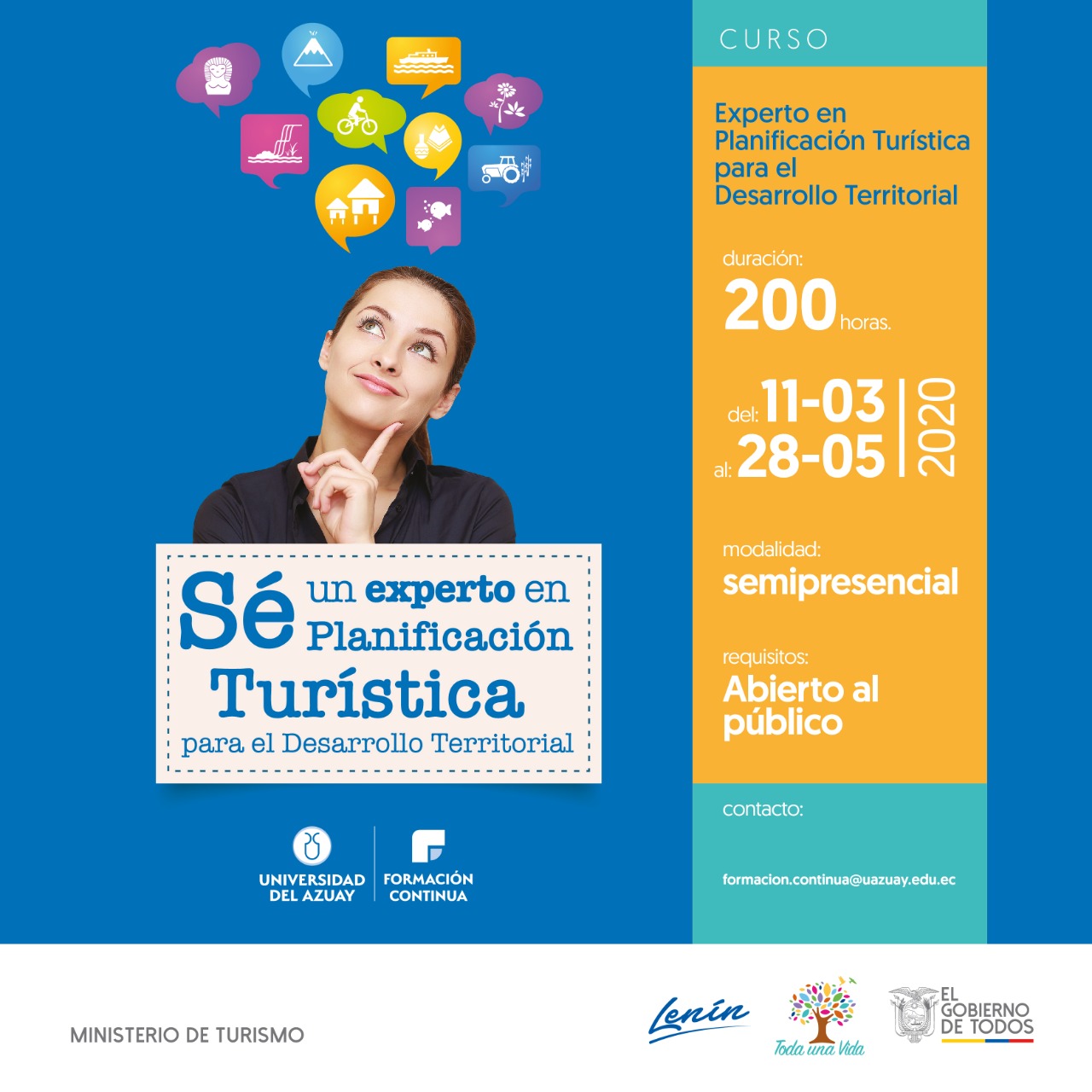 (Cuenca, Azuay, 24-01-2020) Del 11 de marzo al 28 de mayo se contará con un espacio académico que contribuirá al fortalecimiento de las capacidades prospectivas y de gestión del turismo con el curso “Experto en Planificación Turística para el Desarrollo Territorial”.
