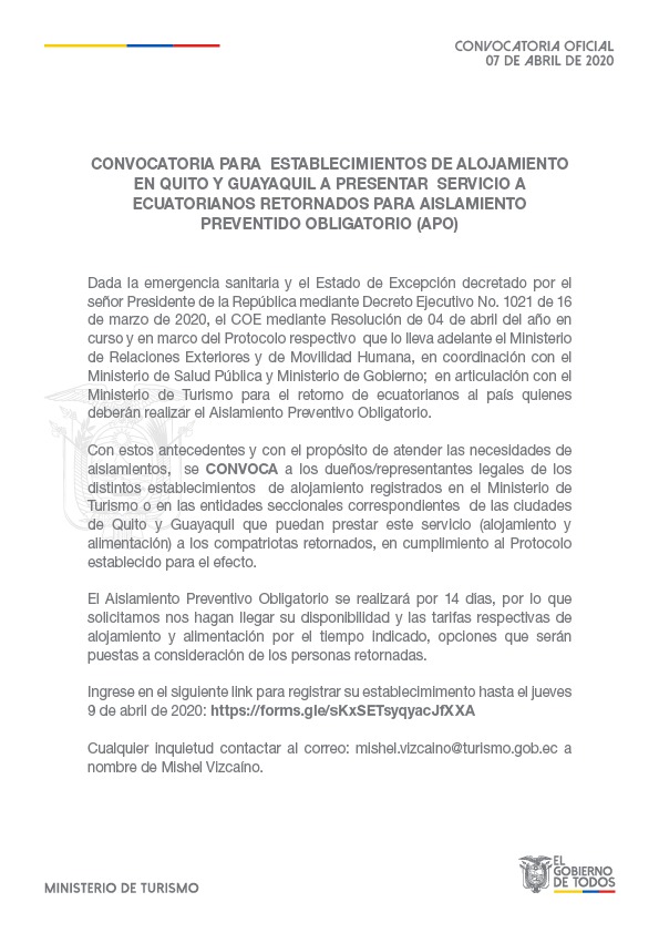 Atención y BienestarSi tienes una denuncia puedes hacerla a través de nuestro correo electrónico: denuncias@turismo.gob.ec o puedes comunicarte con un asesor a través de la cuenta de Skype direcciondebienestarturistico@gmail.com. Para apoyo en relación a la vigencia y trámites de salvoconductos contáctese al correo: registrocontroldireccion@gmail.com